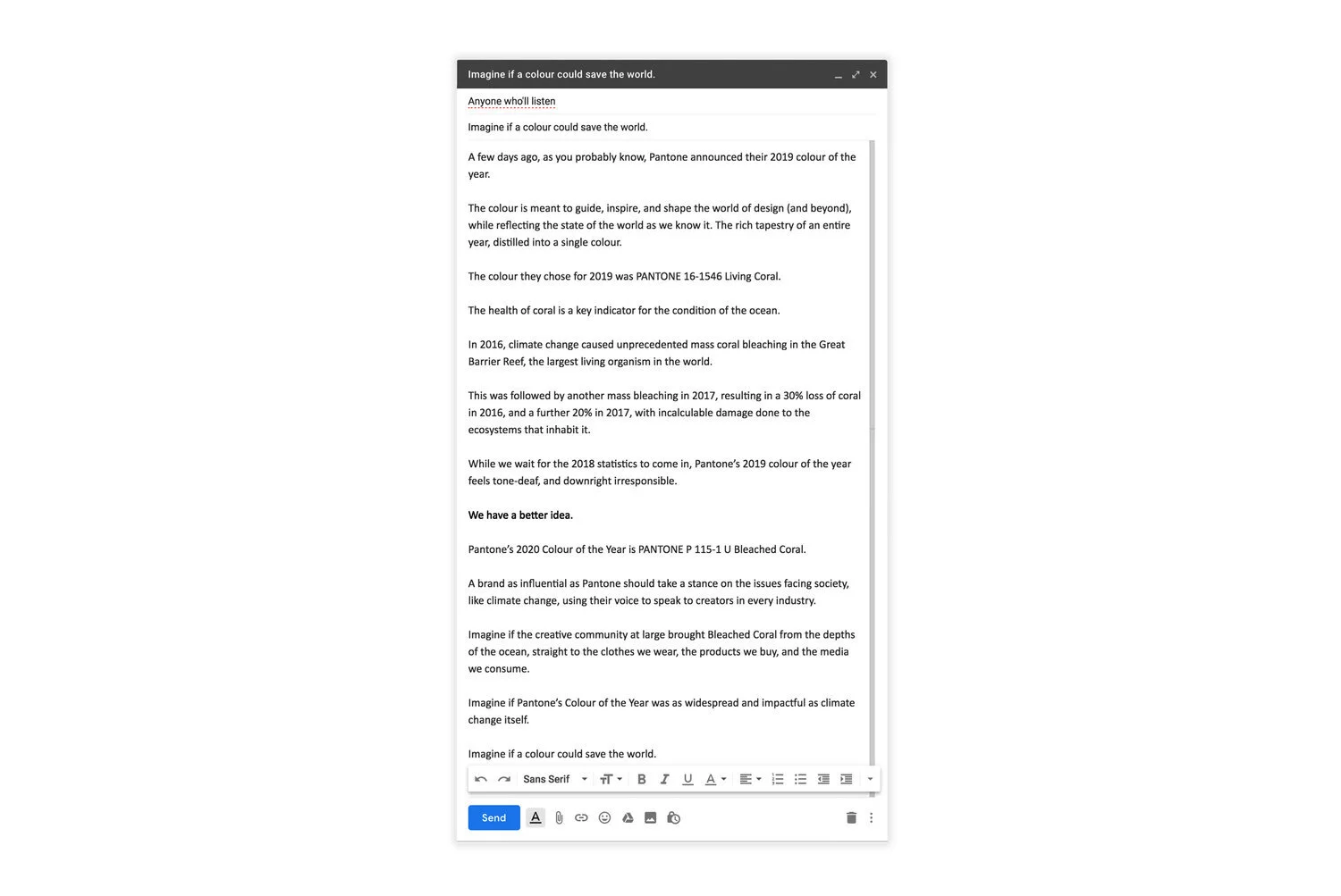 Our strategy wasn’t to contact Pantone directly, but to light a fire under them by contacting the people who they would listen to—creators, designers, and brands.